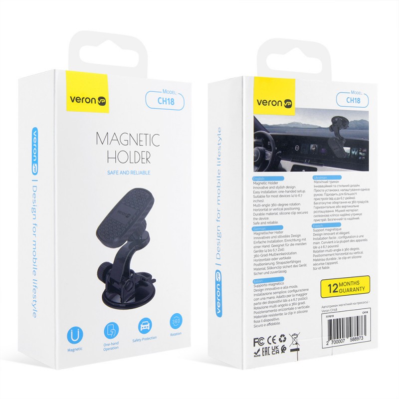 Автомобільний тримач Veron CH18 — це зручне та надійне рішення для кріплення вашого смартфона в автомобілі. Оснащений магнітом і присоскою, він забезпечує надійну фіксацію пристрою на лобовому склі або приладовій панелі.