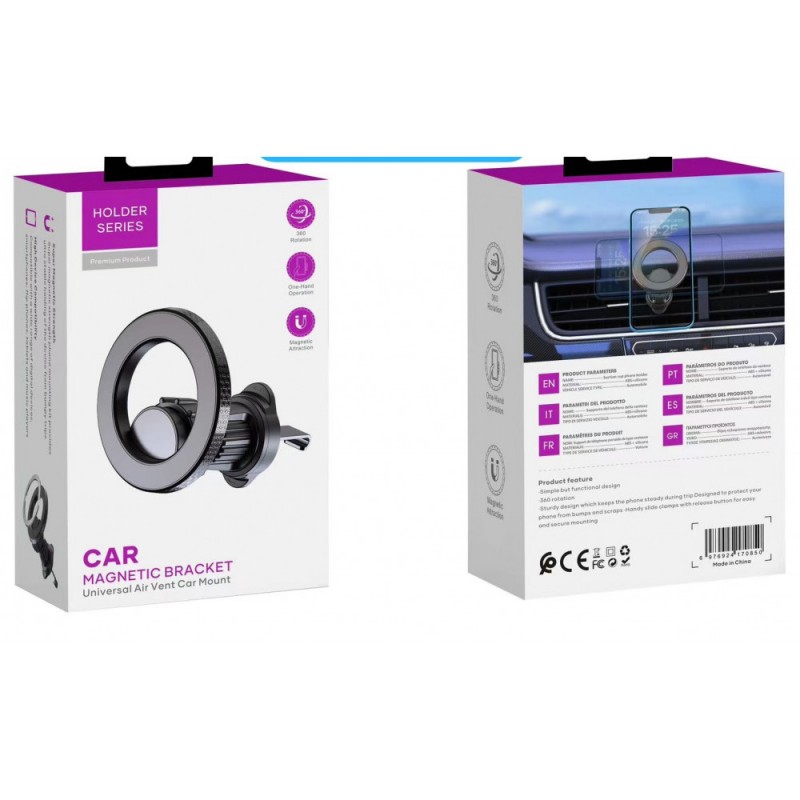 Цей тримач використовується в автомобілях і кріпиться до повітропроводу. Він підходить для всіх типів смартфонів, забезпечуючи безпечне і зручне використання навігації та інших функцій телефону під час водіння.