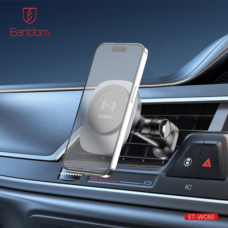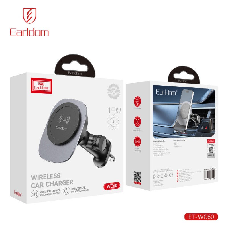 Автомобільний тримач магнітний з бездротовою зарядкою 15W Earldom ET-WC60, ABS, алюмінієвий сплав