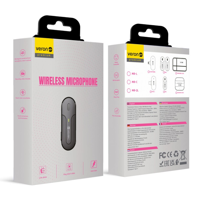 Бездротовий петлічний мікрофон Veron Lightning M8-L ідеально підходить для запису звука на смартфони з роз'ємом Lightning. Компактний і легкий, він забезпечує високу якість записуваного звуку, звільняючи вас від проводів. У комплект входить зручний кейс для зарядки, який забезпечує тривалу роботу мікрофона і захищає його під час перенесення. Ідеальний вибір для блогерів, журналістів і всіх, хто цінує якість звуку в мобільному запису.