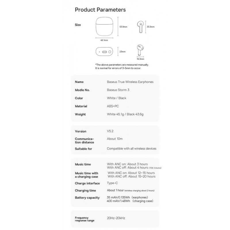 Ця гарнітура відмінно підходить для використання в різних ситуаціях: під час поїздок на роботу, занять спортом, спілкування в громадському транспорті або вдома. Завдяки бездротовому підключенню та компактному дизайну, TWS Baseus Storm 3 легко носити з собою та використовувати в будь-якому місці.