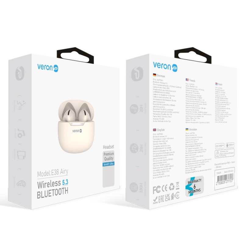 Гарнітура Veron E38 Airy TWS забезпечує високу якість звуку та комфорт при використанні, позбавляючи від незручності проводів. Вона дозволяє приймати дзвінки та керувати музикою, не виймаючи телефон з кишені.
