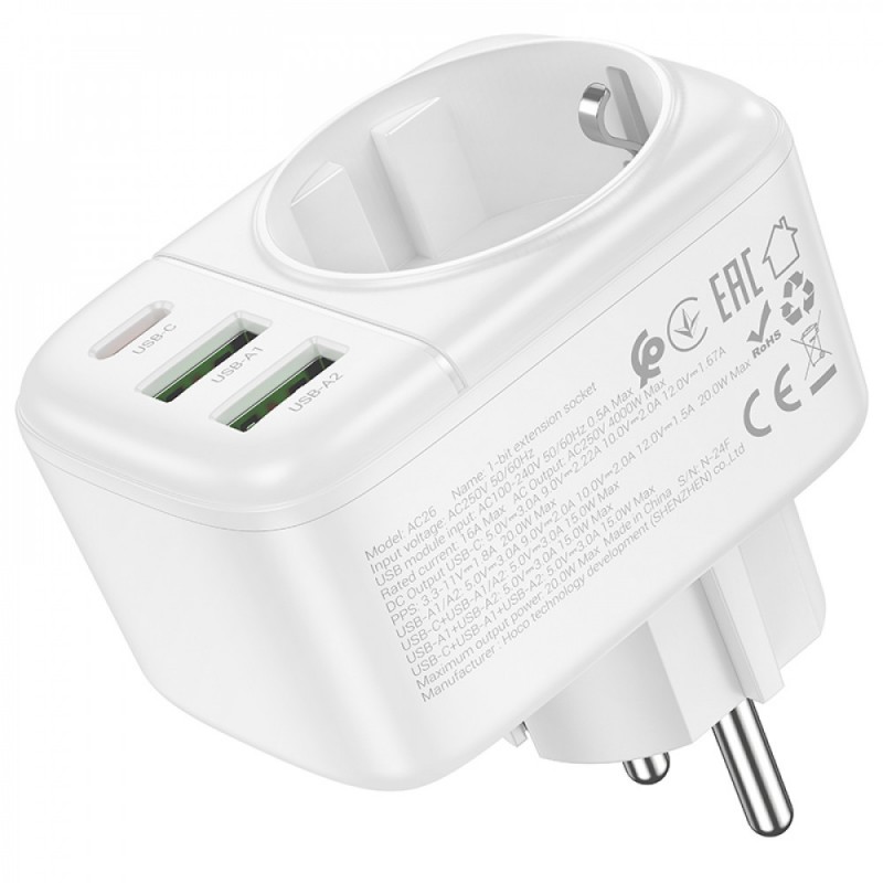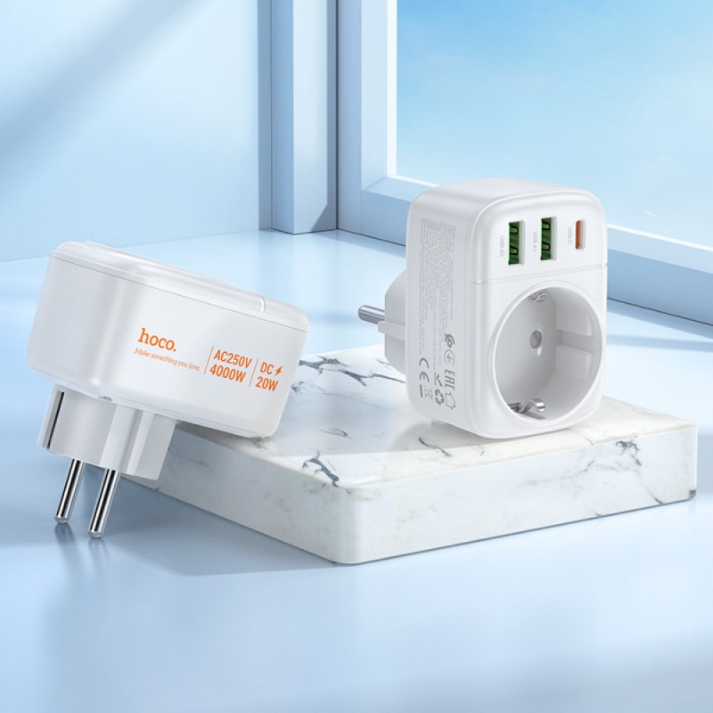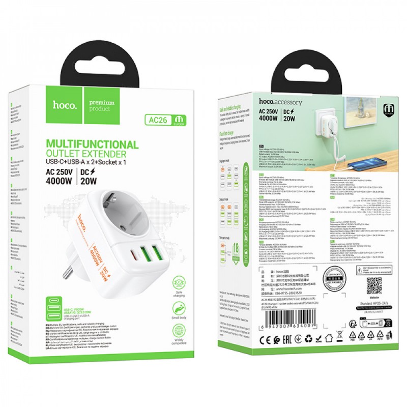 Фільтр живлення Hoco AC26 — це надійний пристрій з однією однотипною розеткою та потужністю до 4000 Вт. Він виконаний з вогнестійкого полікарбонату та АБС, що гарантує безпеку використання. Модель оснащена двома виходами USB: USB-C з потужністю 20 Вт і двома USB-A, також по 20 Вт, що дозволяє заряджати кілька пристроїв одночасно. Компактні розміри 78х72х50 мм та легка вага в 99 г роблять його ідеальним вибором для дому та в поїздках.