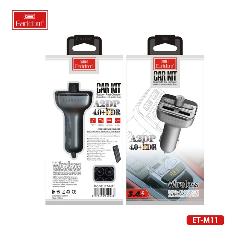 Earldom ET-M11 оснащений яскравим LED-дисплеєм, на якому відображається поточна FM-частота, а також функціональним мікрофоном для зручного гучного зв'язку. Модулятор має слоти для карт пам'яті і два USB-роз'єми, що дозволить вам відтворювати ваші улюблені музичні треки у форматах MP3, WMA і WAV. Підтримка Bluetooth 5.1 забезпечує надійне і швидке з'єднання, а широкий діапазон частот передачі (87,5 - 108 МГц) гарантує стабільний прийом.