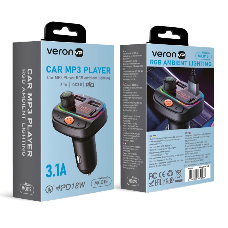 FM-модулятор Veron MC015 — це пристрій, що дозволяє передавати аудіосигнал з вашого смартфона або іншого пристрою на автомобільну аудіосистему через FM-частоти.