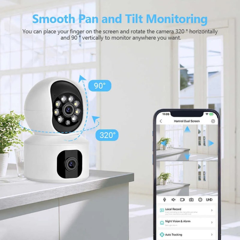 Камера оснащена функцією обертання на 355° і нахилу на 45°, що забезпечує плавний огляд на широкий діапазон. З вбудованим мікрофоном і динаміком ви зможете спілкуватися з близькими, перебуваючи далеко від дому, завдяки чистому двосторонньому звуку.