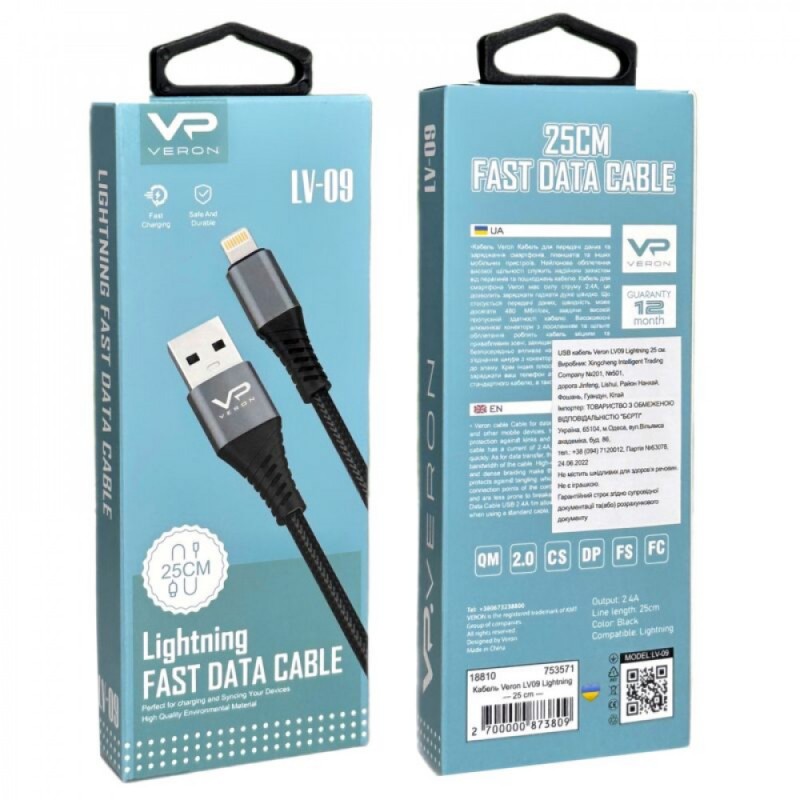 Компактний кабель Veron стане незамінним помічником для зарядки пристрою поза домом. Довжина в 0.25 метра ідеально підходить для зарядки від Power Bank або синхронізації з ноутбуком, дозволяючи уникнути плутанини з довгими шнурами. Його міцна оплетка з силікону та металеві коннектори забезпечують високу надійність і довговічність, а сила струму 2.4A гарантує швидку та якісну зарядку.