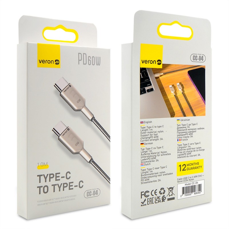Кабель USB Type-C to Type-C Veron CC04 призначений для швидкої передачі даних та зарядки пристроїв. З потужністю до 60W він забезпечує високу швидкість підзарядки для ваших гаджетів, а якісні матеріали, такі як нейлон, роблять його більш надійним та стійким до пошкоджень.
