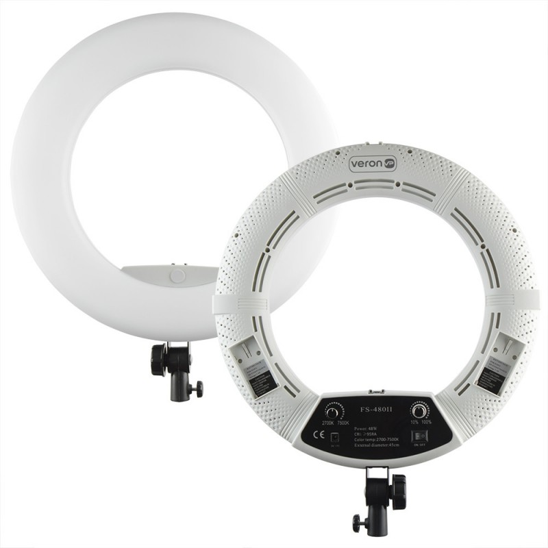 Лампа доступна у трьох стильних кольорах: білий, чорний та рожевий. Вона може працювати як від мережі, так і від акумуляторів, що надає вашому обладнанню мобільність. Серед особливостей Veron FS-480 II — можливість регулювання яскравості, кольорової температури та кута нахилу з фіксацією.