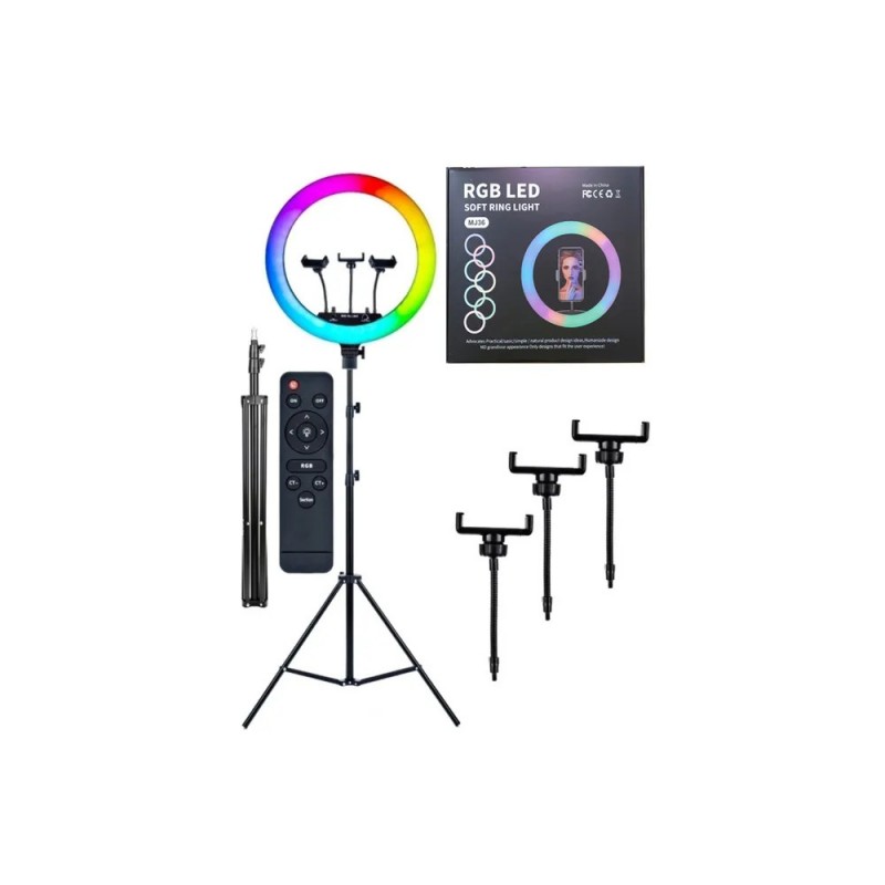 Різнокольорова кільцева світлодіодна лампа RGB LED з трьома тримачами для телефону та Bluetooth пультом для дистанційного керування камерою телефону. Чудовий варіант для блогерів, тік тока, інстаграма, фотосесій і відеозйомок. Кільцева лампа використовується як додаткове освітлення при проведенні фото і відеозйомок. У тримач для телефону, вбудований в лампу, можна встановити смартфон з діагоналлю до 6,5 дюймів. Обертання на 360 градусів для регулювання кута. Ви самі можете налаштовувати інтенсивність світлового потоку, переключатися між кольорами, в цій лампі 21 RGB режим, також збільшувати і приглушувати яскравість. Кільцева світлодіодна лампа набула великої популярності серед візажистів, фотографів, ютуберів, блогерів, стилістів, косметологів, всіх тих, хто так любить якісні фото та гарний світ
