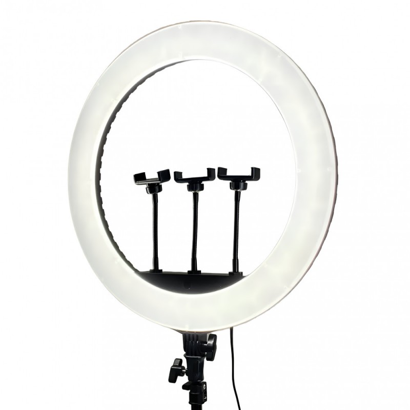 Кільцева лампа з великою кількістю світлодіодів та двома диммерами для регулювання кольору. Лампа підійде як для любителів, так і для професіоналів у сфері відео та фотографії. Є кріплення для смартфонів і фотоапаратів. Регулювання світла плавне, можна вибрати підходящий - теплий, нейтральний, холодний. Потужність 72.0 (Вт). Комплект включає: лампу, пульт, кріплення для смартфона, сумку, шнур живлення.