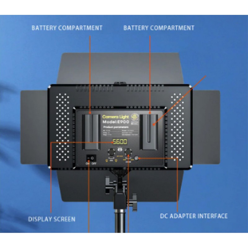 Лампа відеосвітло LED Veron E900 з дисплеєм 30x17 см і 896 світлодіодами пропонує діапазон кольорової температури 3000K-6500K. Зручний пульт дозволяє легко налаштовувати яскравість і колір, забезпечуючи ідеальні умови для зйомки. Вона працює як від мережі, так і від акумулятора, що робить її мобільною та універсальною. Компактний розмір і висока якість світла роблять цю лампу ідеальним інструментом для фотографів і відеоблогерів.