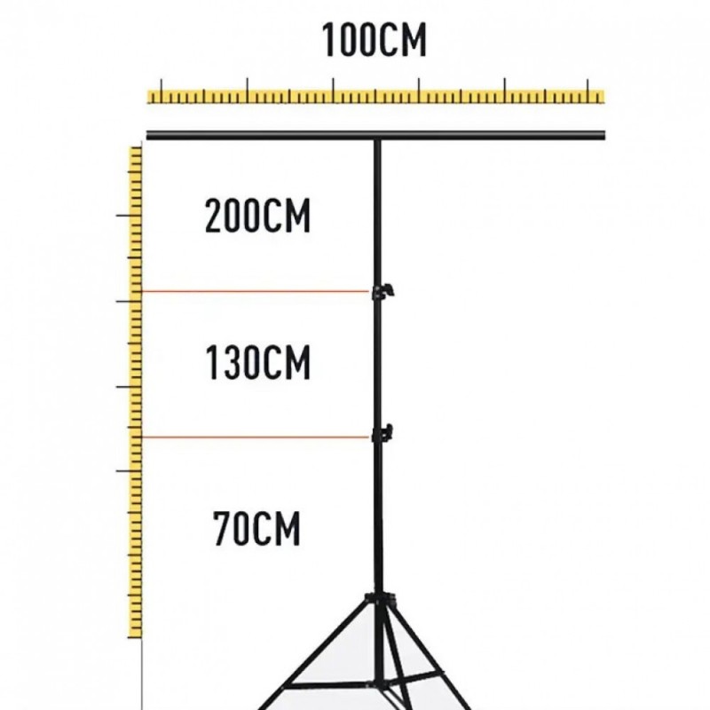 Стійка виконана з високоякісного алюмінієвого сплаву і витримує максимальне навантаження до 2 кг. Вона оснащена спеціальною трикутною розпоркою для стабілізації кріплення і регулюється по висоті, що дозволяє створювати фотозону потрібного розміру. Стійка компактно складається для зручного зберігання і транспортування. Простота складання і надійна фіксація перекладини роблять її ідеальним вибором для створення професійних фонів.