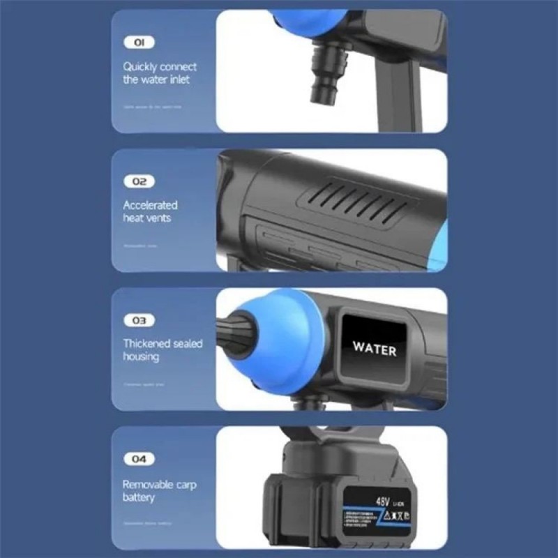 Портативна автомийка високого тиску MDHL 48V, 200Вт, 30бар, 3000об/хв – це ідеальне рішення для всіх, хто цінує зручність і ефективність у догляді за автомобілем та домом. Ця бездротова мийка дозволяє використовувати її в будь-якому місці, без необхідності мати доступ до електромережі.