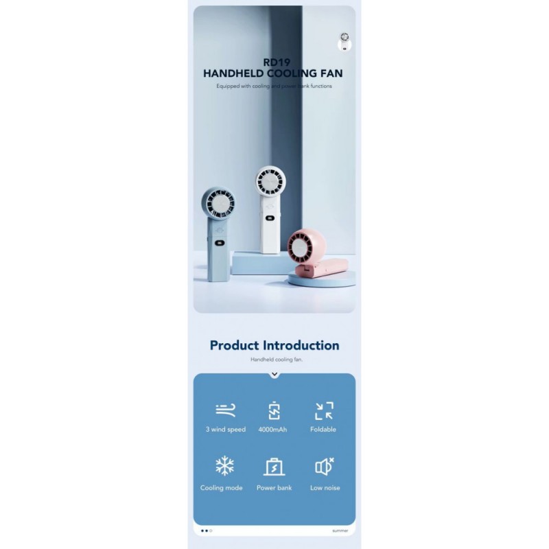 Компактний і зручний вентилятор RD19 — надійне рішення для охолодження вдома, в офісі або в дорозі. Завдяки потужному акумулятору і швидкій зарядці пристрій забезпечує ефективну роботу в будь-яких умовах.