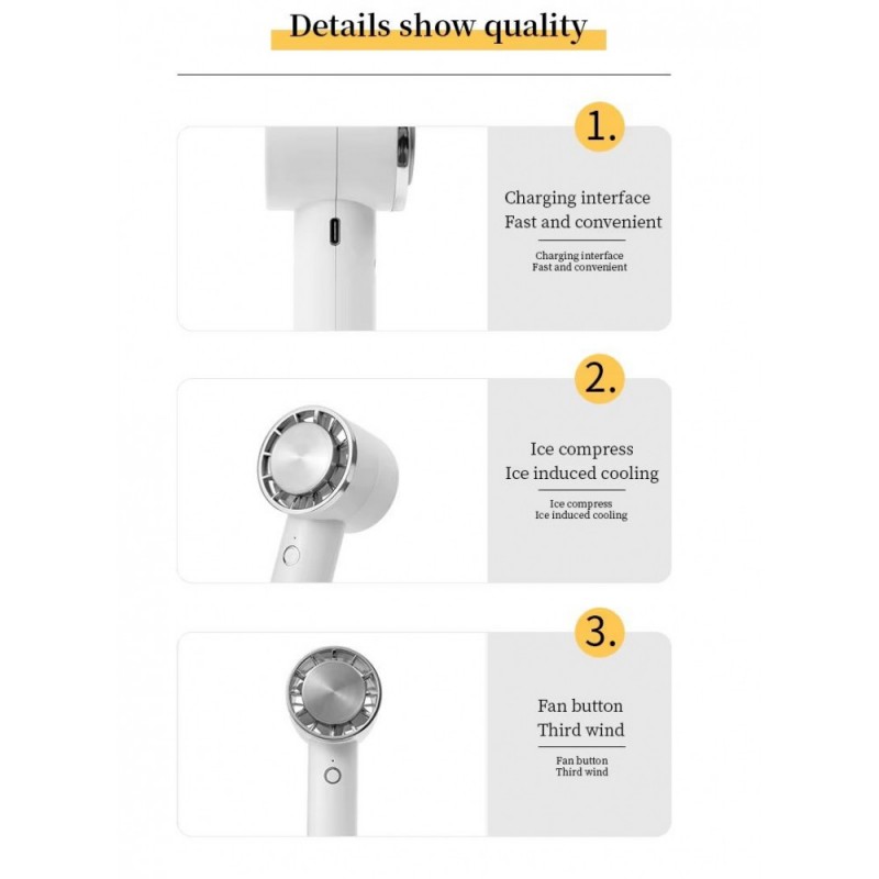Для початку використання зарядіть вентилятор через USB кабель до повної зарядки. Увімкніть вентилятор, натиснувши на кнопку керування, і виберіть один з трьох режимів обдуву залежно від ваших уподобань. Використовуйте вентилятор у будь-якому зручному місці і насолоджуйтесь свіжим повітрям.