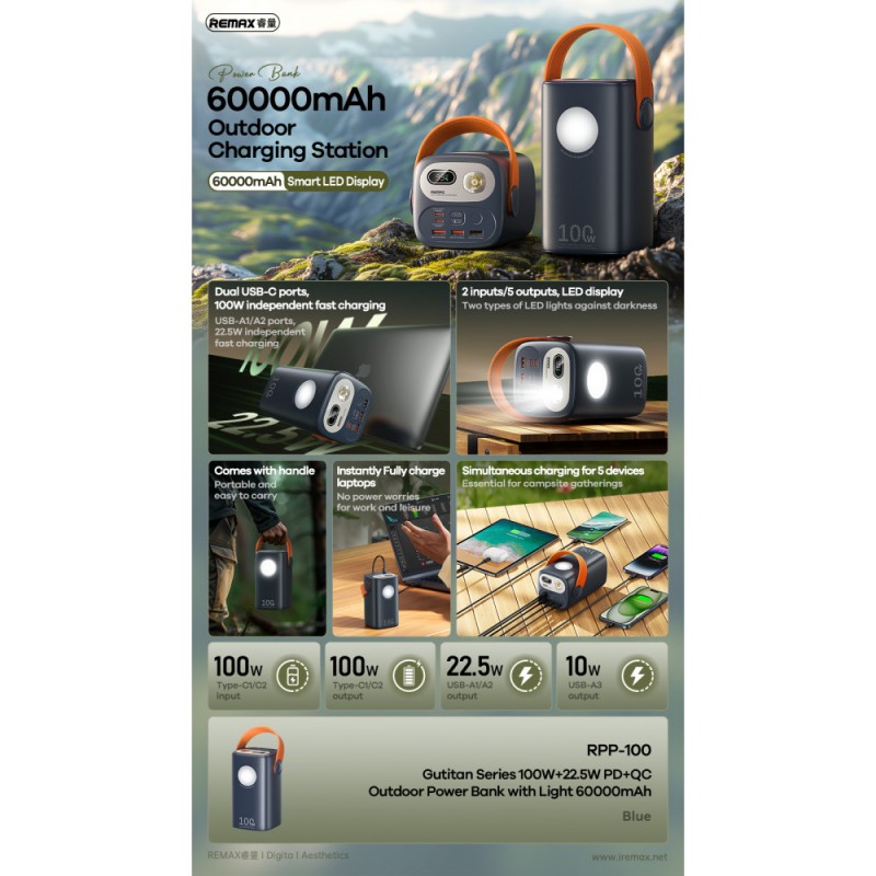 Power Bank Remax RPP-100 - це потужний та багатофункціональний зовнішній акумулятор з ємністю 60000 mAh та потужністю 100W, здатний заряджати не лише мобільні пристрої, а й ноутбуки. Модель оснащена інтелектуальною системою управління напругою, що забезпечує швидку та безпечну зарядку для всіх ваших гаджетів. Завдяки трьом USB портам та двом універсальним роз'ємам Type-C, ви зможете без зусиль підключати кілька пристроїв одночасно.