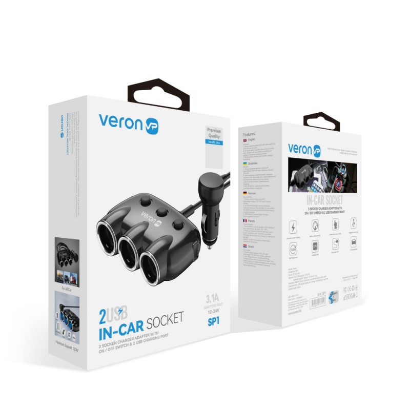 Розгалужувач прикурювача Veron SP1 з 3 портами та загальним виходом 3.1A ідеально підходить для використання в автомобілі, дозволяючи одночасно заряджати кілька пристроїв. Він виконаний у стильному дизайні та доступний в чорному і білому кольорах, що робить його відповідним для будь-якого інтер'єру автомобіля. Компактні розміри пристрою дозволяють легко розмістити його в будь-якому місці салону, а висока продуктивність забезпечує швидку зарядку.