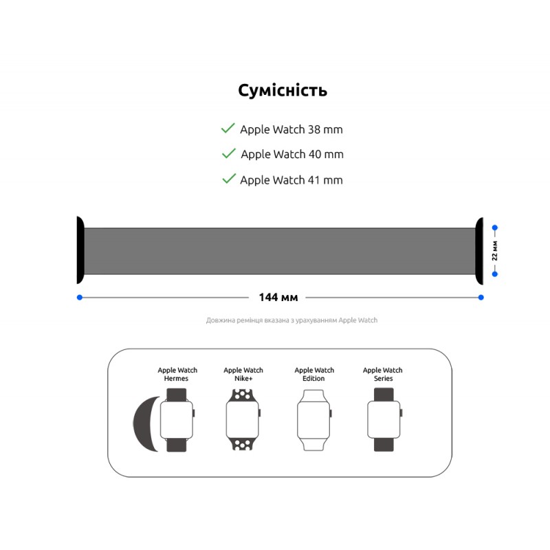 Ремінець призначений для використання з Apple Watch, забезпечуючи надійне кріплення і стильний зовнішній вигляд.