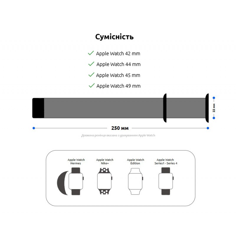 Ремінець підходить для використання з годинниками Apple Watch серій 1-3, а також моделей 49/46/45/44/42 мм. Ідеальний для повсякденного носіння та особливих заходів.
