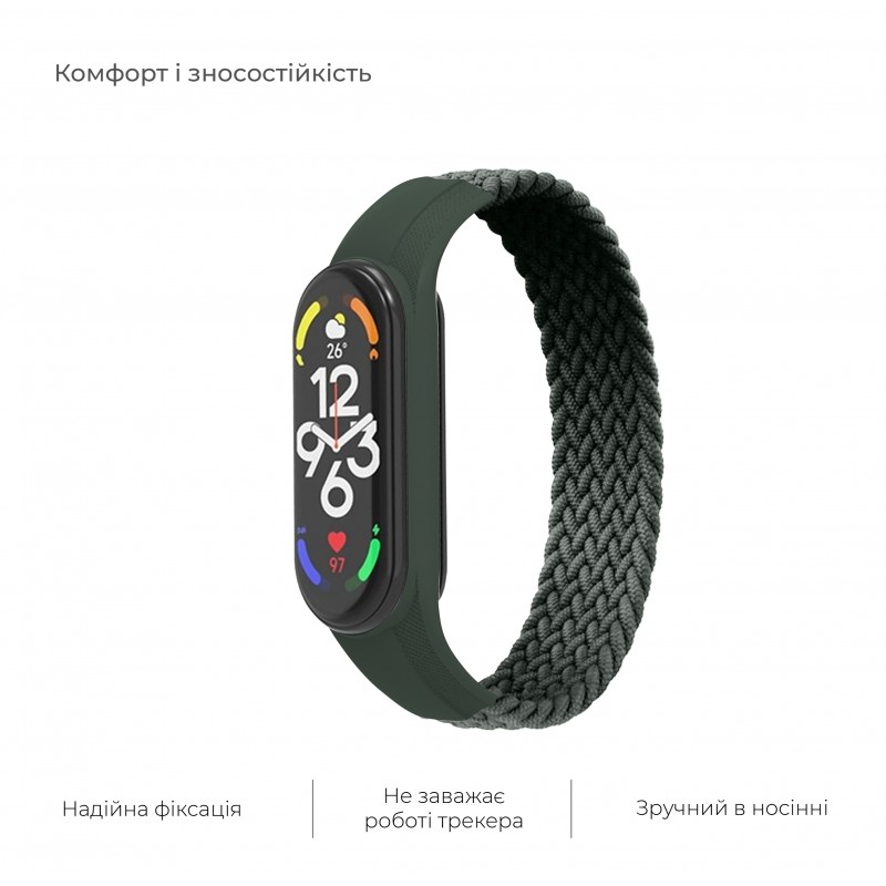 Цей ремінець створений для тих, хто цінує стиль і комфорт. Він спеціально розроблений для Xiaomi Mi Band 7, 6, 5 і 4, пропонуючи користувачеві високоякісний плетений матеріал і зручну посадку. Розмір M підходить для середніх за розміром зап'ясть.