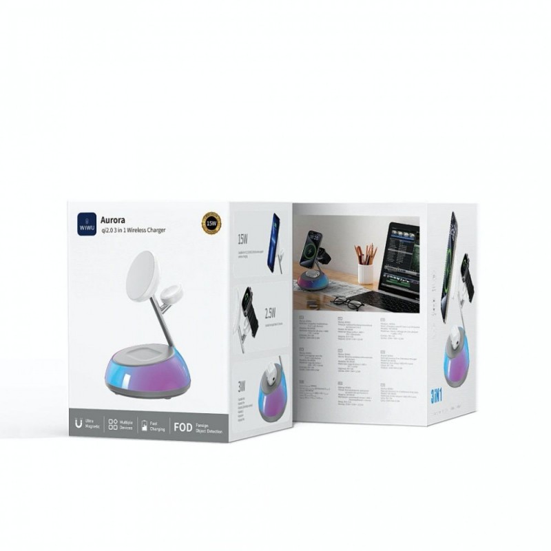 Беспроводное зарядное устройство WiWU Wi-W036 MagSafe представляет собой многофункциональное устройство, которое позволяет одновременно заряжать до трех устройств. Оно обеспечивает стабильную и быструю зарядку благодаря поддержке MagSafe и совместимо с iPhone, AirPods и Apple Watch. Элегантный алюминиевый корпус с нескользящим покрытием гарантирует надежную фиксацию гаджетов во время зарядки.