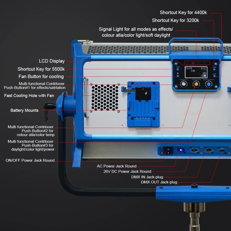 Этот видеосвет решает задачу освещения в сложных условиях, позволяет подбирать нужную цветовую температуру и уровень яркости, создавая профессиональное освещение для съемок. Он также имеет заранее запрограммированные световые эффекты, что значительно упрощает работу осветителя.