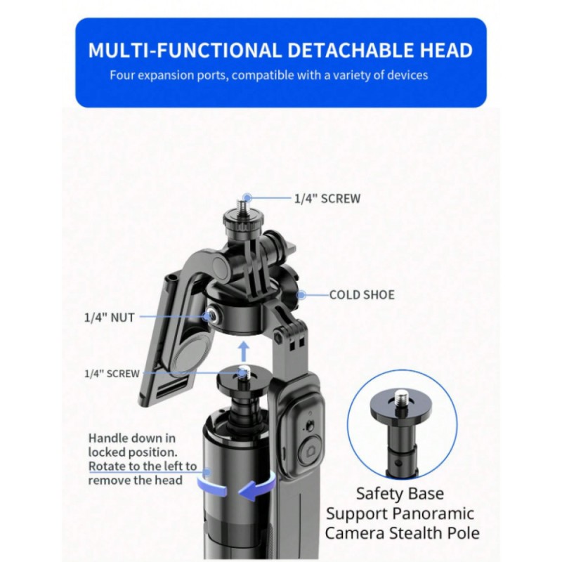 Разложите монопод-трипод до нужной высоты, закрепите камеру или смартфон, подключите Bluetooth-кнопку и начните съемку. Убедитесь, что устройство стоит на устойчивой поверхности для лучшей стабилизации.