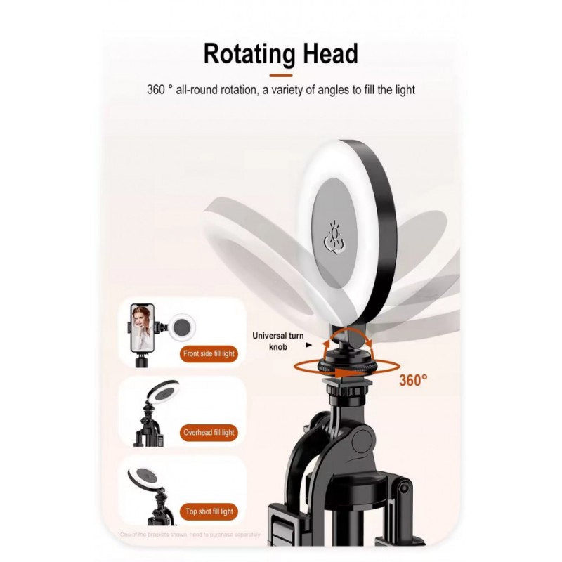 Подключите устройство к источнику питания через USB, используйте кнопки управления для настройки яркости и цветовой температуры. Закрепите зажим на телефоне или другом устройстве для удобного использования. Вращайте кольцевой свет для достижения оптимального угла освещения.