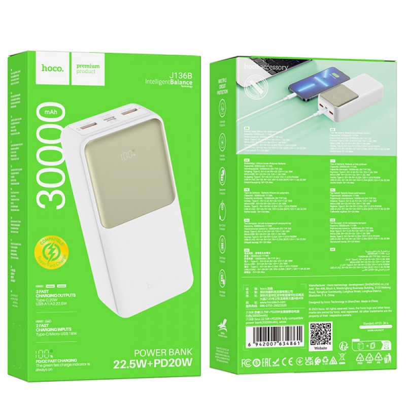Портативное зарядное устройство Hoco J136B 30000 mAh 22.5W+PD20W, белое