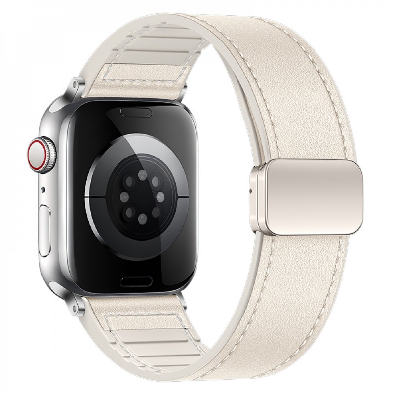 Этот ремешок сочетает в себе экологически чистый силикон и верхний слой композитной коровьей кожи, предлагая как комфорт, так и стиль. Магнитная застежка делает регулировку длины простой и удобной, что позволяет адаптировать ремешок к любому запястью.