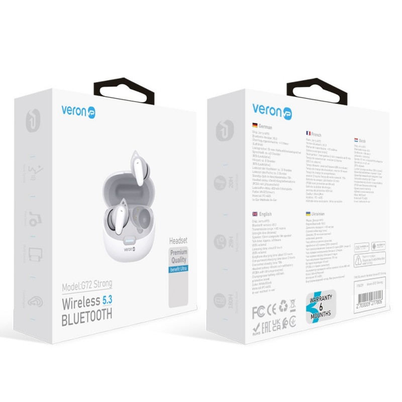 Комплект наушников Veron G72 Strong включайте, удерживая кнопку на каждом наушнике, когда они извлечены из кейса. Подключите их к своему устройству через Bluetooth, отыскав Veron G72 в списке доступных устройств. После подключения наслаждайтесь музыкой или звонками. Храните наушники в зарядном кейсе для продления времени автономной работы.