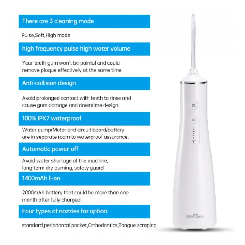 Промивна машина ідеальна для домашнього використання, а також у поїздках завдяки портативному дизайну. Підходить для щоденного чищення між зубами, видалення залишків їжі та підтримання свіжості дихання. Може бути використана як доповнення до звичайної зубної щітки для комплексної гігієнічної обробки порожнини рота.