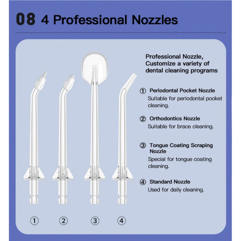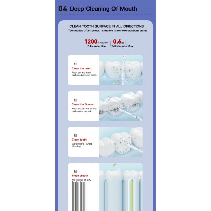 Цей ірригатор вирішує проблеми, пов’язані з накопиченням нальоту та залишків їжі між зубами, що може призвести до карієсу та захворювань ясен. Використання ірригатора сприяє поліпшенню загального стану порожнини рота, запобігаючи неприємному запаху та забезпечуючи свіжість дихання.