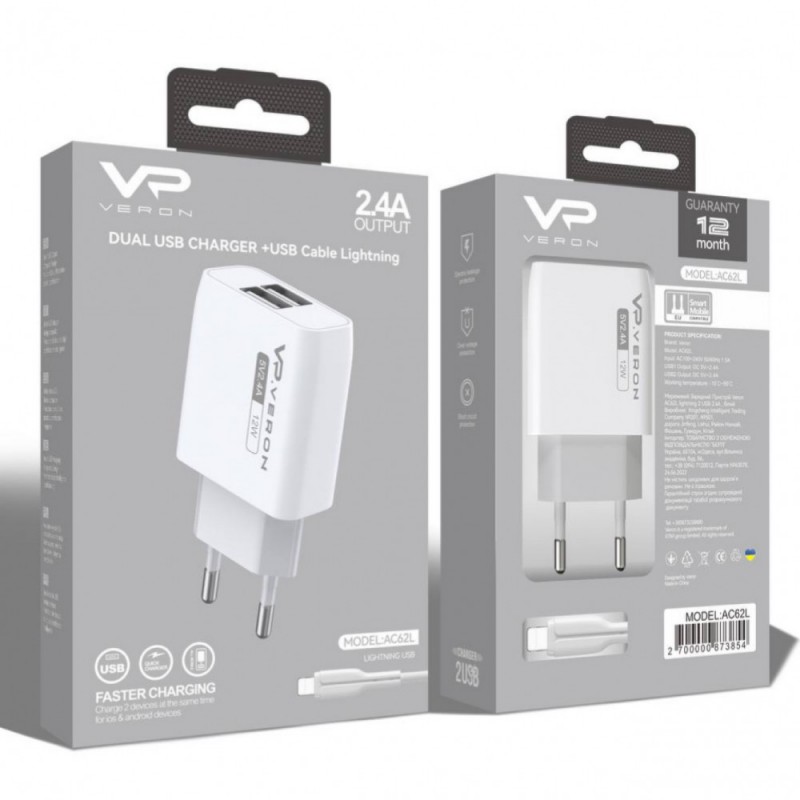 Мережевий зарядний пристрій Veron AC62C, 2.4A, USB C Cable