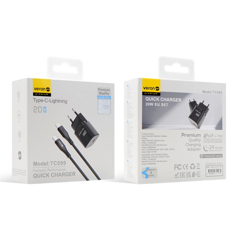 Мережевий зарядний пристрій Veron TC-099 з кабелем Type C to Lightning