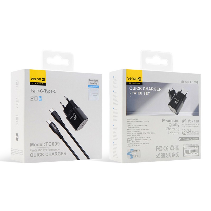 Мережевий зарядний пристрій Veron TC-099 оснащено технологією швидкої зарядки QC3.0, що дозволяє значно скоротити час заряду пристроїв. У комплект входить кабель Type C на Type C довжиною 1 метр, що забезпечує надійне з'єднання і високу швидкість передачі даних.