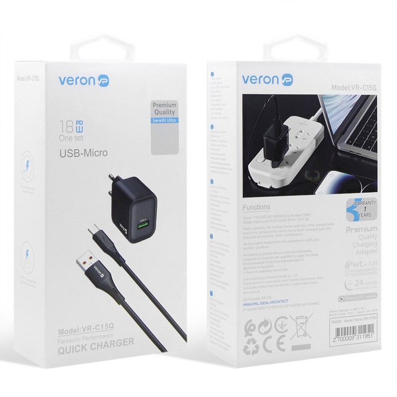 Мережевий зарядний пристрій Veron VR-C15Q, 18W, з кабелем Micro USB 1м