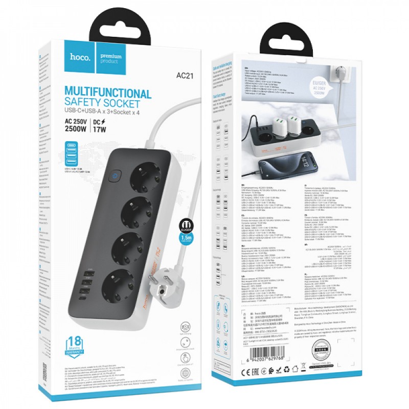 Мережевий фільтр Hoco AC21 - універсальний подовжувач, створений для спрощення процесу зарядки ваших пристроїв. Він підтримує загальну потужність до 2500W та оснащений 4 USB-портами: 3 USB-A (18W) і 1 Type-C (17W). Корпус із вогнестійкого полікарбонату та вбудовані засоби захисту забезпечують безпеку, захищаючи від перевантажень та коротких замикань. Компактний та легкий дизайн робить його зручним у розміщенні.