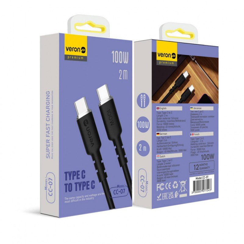 Кабель USB C to C 100W Veron CC07 ідеально підходить для користувачів, які активно використовують сучасні гаджети та потребують надійного та швидкого рішення для зарядки та передачі даних. Він призначений як для власників телефонів і планшетів, так і для професіоналів, які працюють з ноутбуками та іншими пристроями.