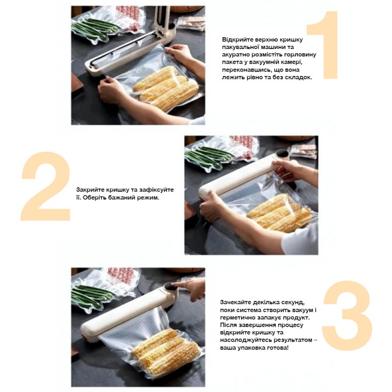 Просто підключіть пристрій до джерела живлення, помістіть продукт у вакуумний пакет і активуйте машину для створення вакууму.