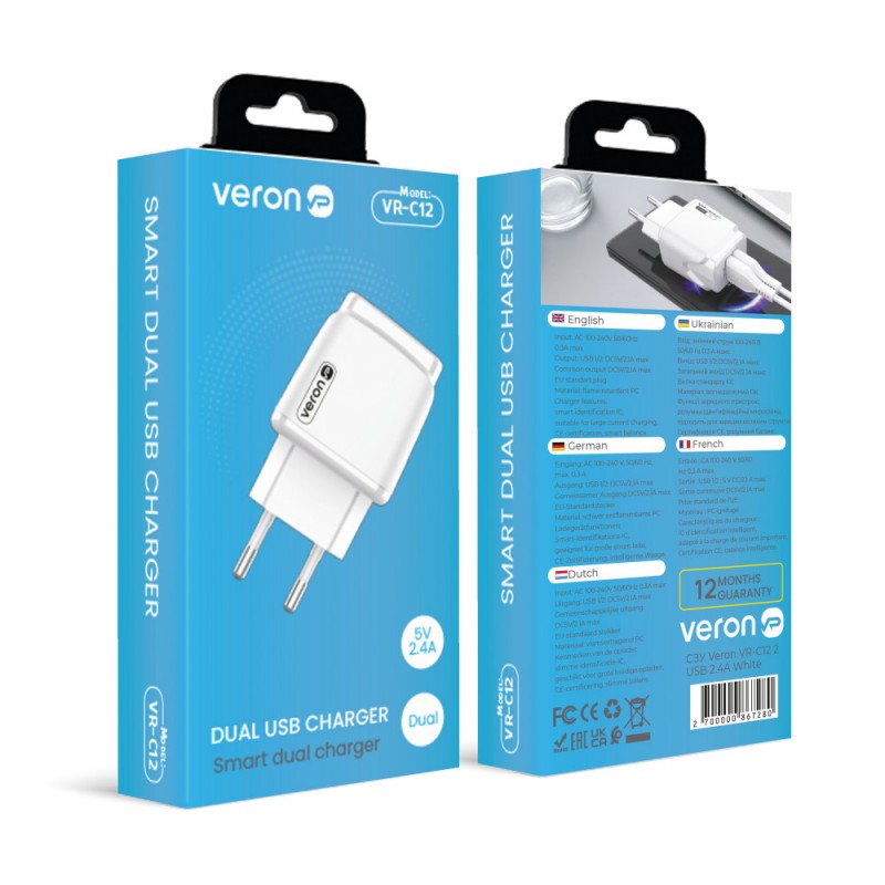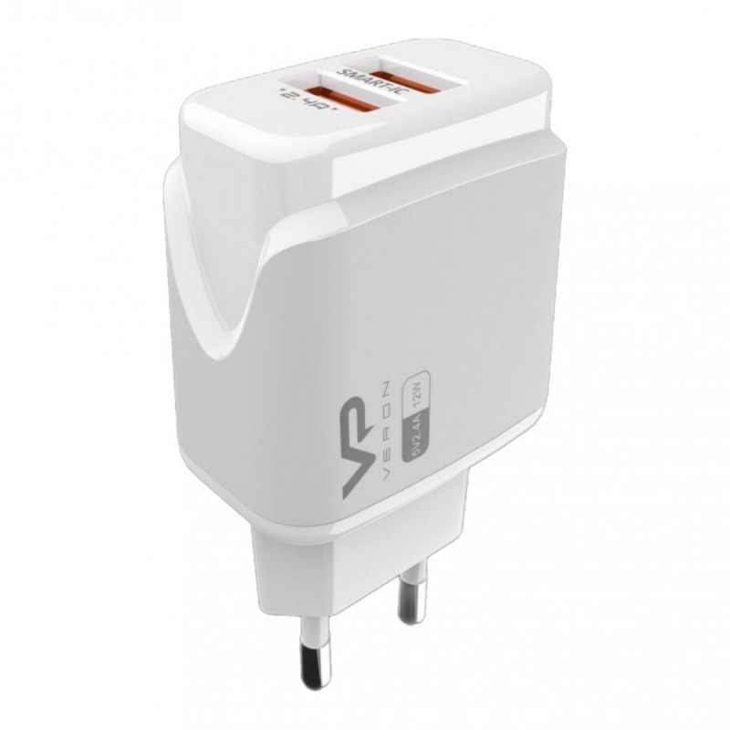 Зарядний пристрій Veron VR-C12 2.4A на 2 USB порти - Безпечна та швидка зарядка